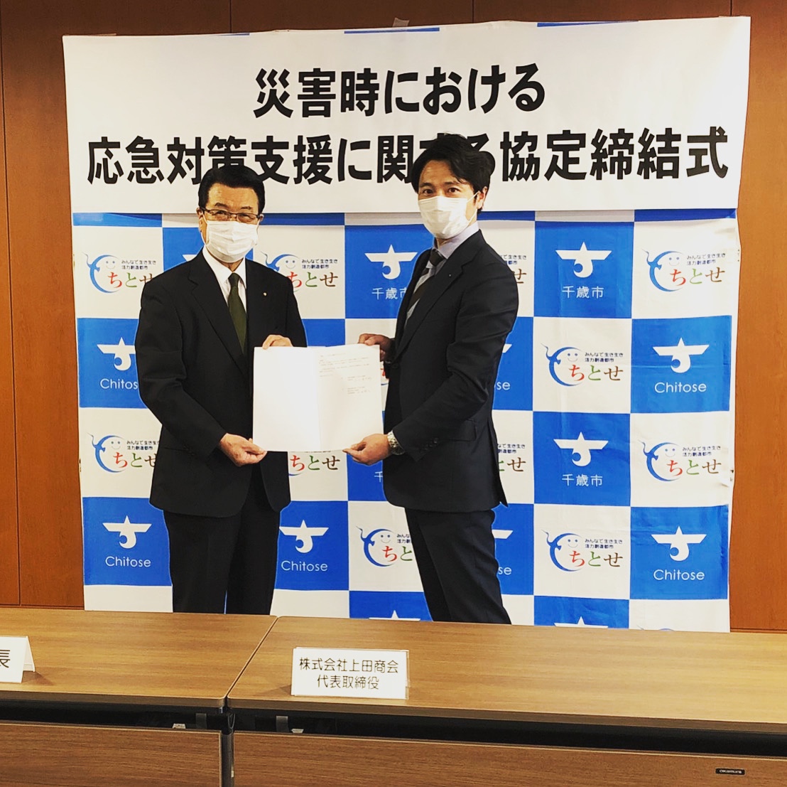 ㈱上田商会は千歳市と災害時の応急対策支援に関する協定を結びました。