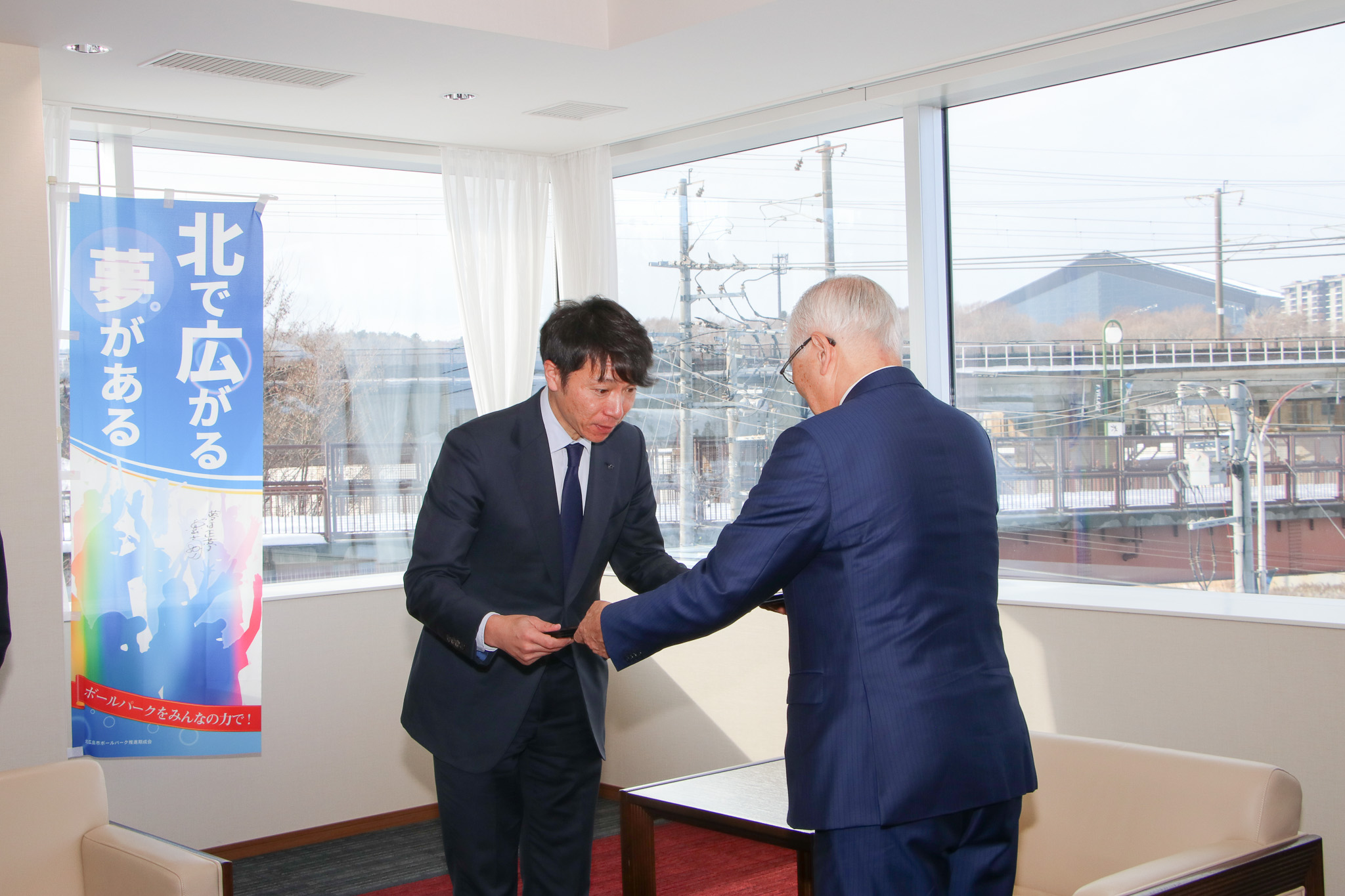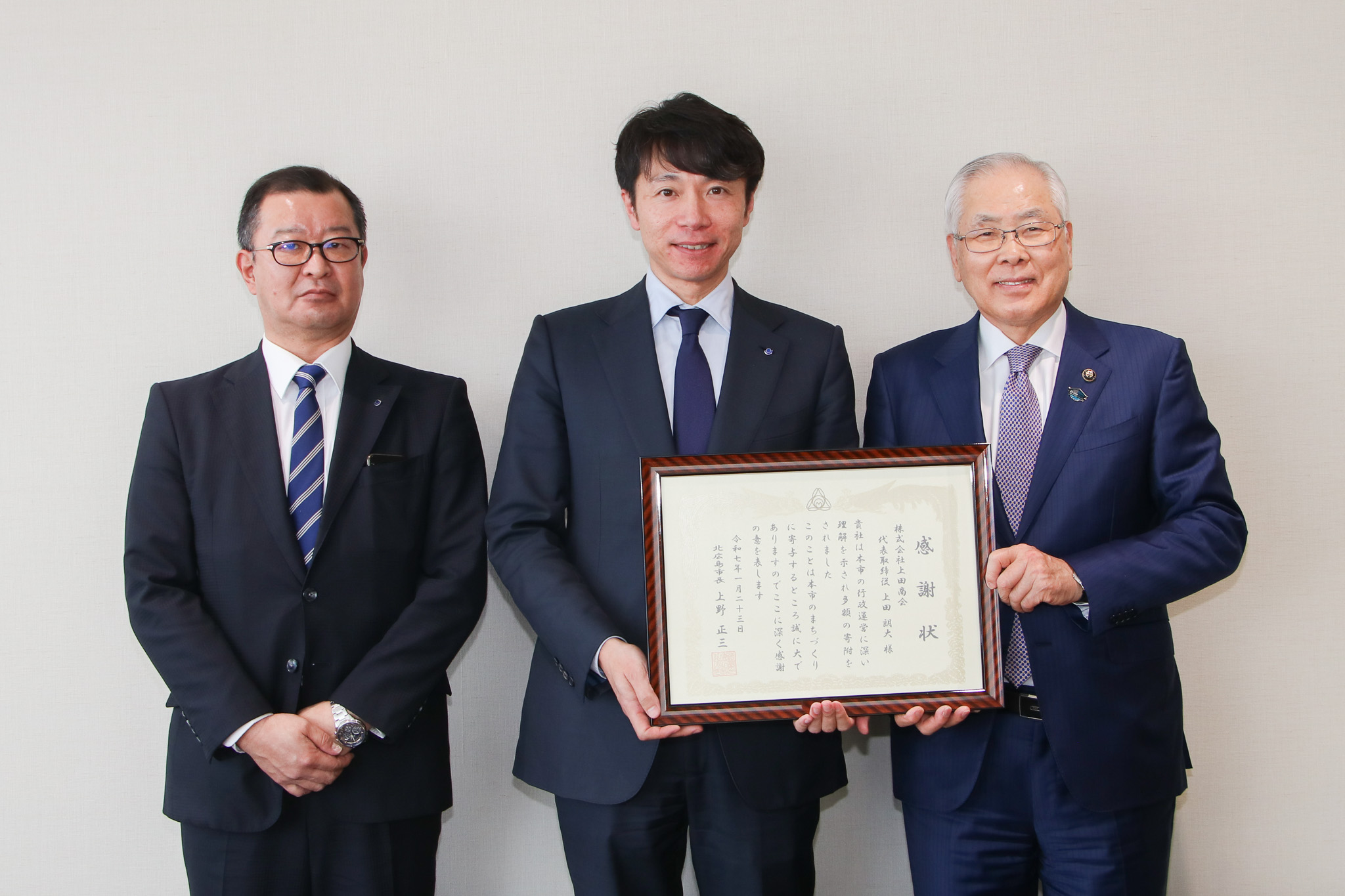 上野市長から感謝状をいただき、上田は「ボールパーク構想実現の一助として有効に活用されることを期待しています」とコメントしました。